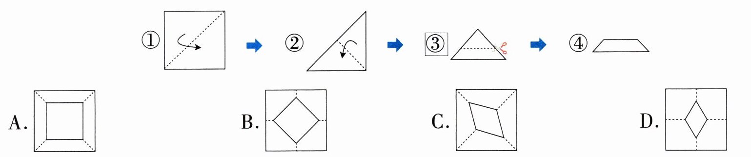 (3)(广州期末真题)将一张正方形纸按下图步骤①、②对折,然后沿图③中平行于底边的虚线剪去一个角,展开后铺平,得到的图形是( )。