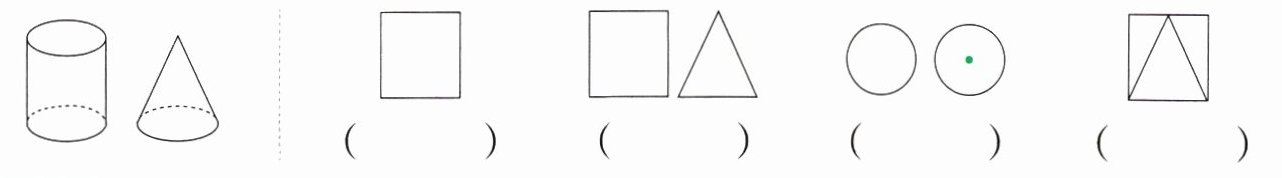 5. 下图是一个圆柱和一个圆锥,右面四幅图分别是从正面、上面、左面、右面哪个方向看到的呢?填一填。