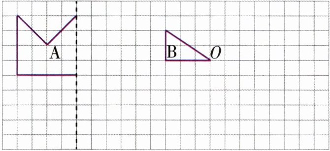 (2)画出先将图形B绕点O按顺时针方向旋转90°,再向右平移3格得到的图形C。