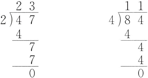 [提示]第一个竖式,个位上2×3 = 6,所以余数为1;第二个竖式,被除数十位上8 = 4×2,所以商的十位数字应该是2。