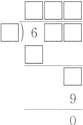 $\begin{array}{r}\square\square\square\\\square\enclose{longdiv}{6\square\square}\\\underline{\square}\\\square\\\underline{9}\\0\end{array}$
