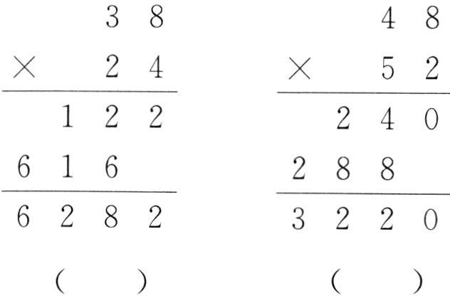 [提示]两位数乘两位数的笔算方法:相同数位对齐,用第二个乘数个位上的数去乘第一个乘数每一位上的数,积的末位与第二个乘数的个位对齐;再用第二个乘数十位上的数去乘第一个乘数每一位上的数,积是多少个“十”,个位上的0可以省略不写,所以积的末位要与第二个乘数的十位对齐;最后把两次乘得的积相加。