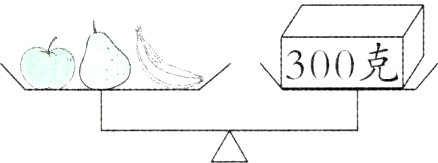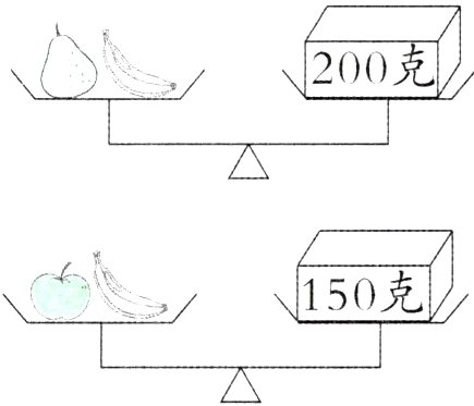 100 50 150 [提示]第一幅图和第二幅图左边相差一个苹果,右边相差300 - 200=100(克),可以判断出苹果的质量是100克;然后根据第三幅图判断出香蕉的质量是150 - 100=50(克),最后根据第二幅图判断出梨的质量是200 - 50=150(克)。