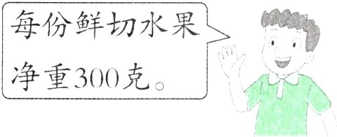 4. 谢老板的水果店提供水果鲜切服务。一个哈密瓜果肉净重2千克,用它做6份鲜切水果后,这个哈密瓜还剩多少克?