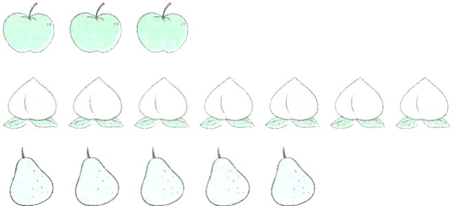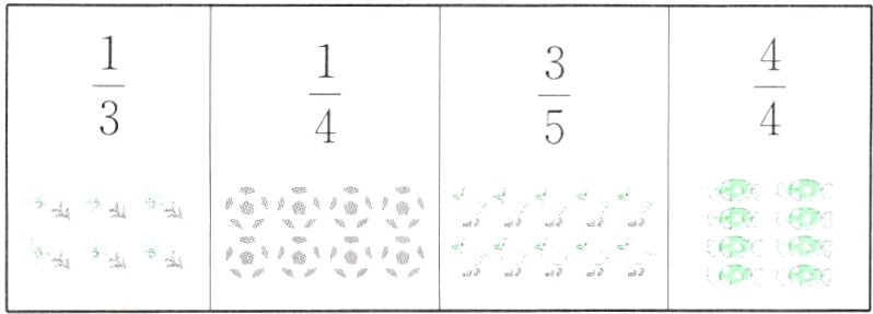 $\frac{3}{15}$ $\frac{7}{15}$ $\frac{5}{15}$ [提示]水果总数量作分母,每种水果的数量作分子。