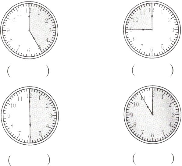 $\frac{5}{12}$ $\frac{3}{12}$ $\frac{6}{12}$ $\frac{11}{12}$ [提示]钟面有12大格,平均分成12份,钟面上每1时占1大格。用分数表示涂色部分,分母是12,涂了几大格分子就是几。