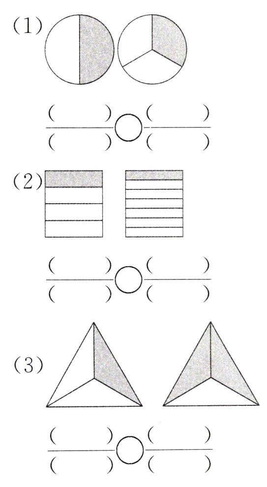 [提示]平均分成的份数是分母,涂色有几份,分子就是几,空白的有几份,分子就是几,再比较两个分数的大小即可。