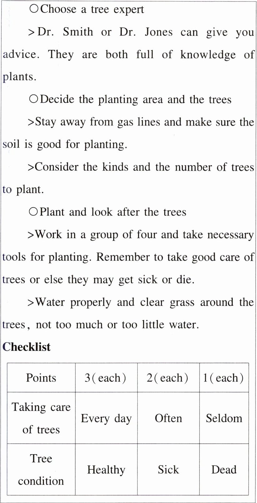 20.D 推理判断题。根据 Checklist 中的介绍可知,每天照顾树木得 3 分,树木生病了得 2 分。由此推知,Jim 会得 5 分。故选 D。