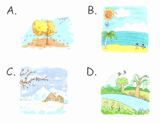 二、1. spring; D 2. autumn; A 3. summer; B 4. winter; C