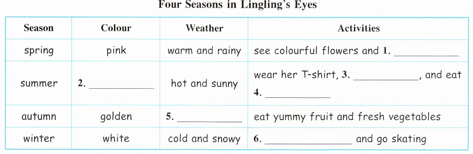 三、玲玲正在分享对四季的感受。根据玲玲的描述,完成表格。