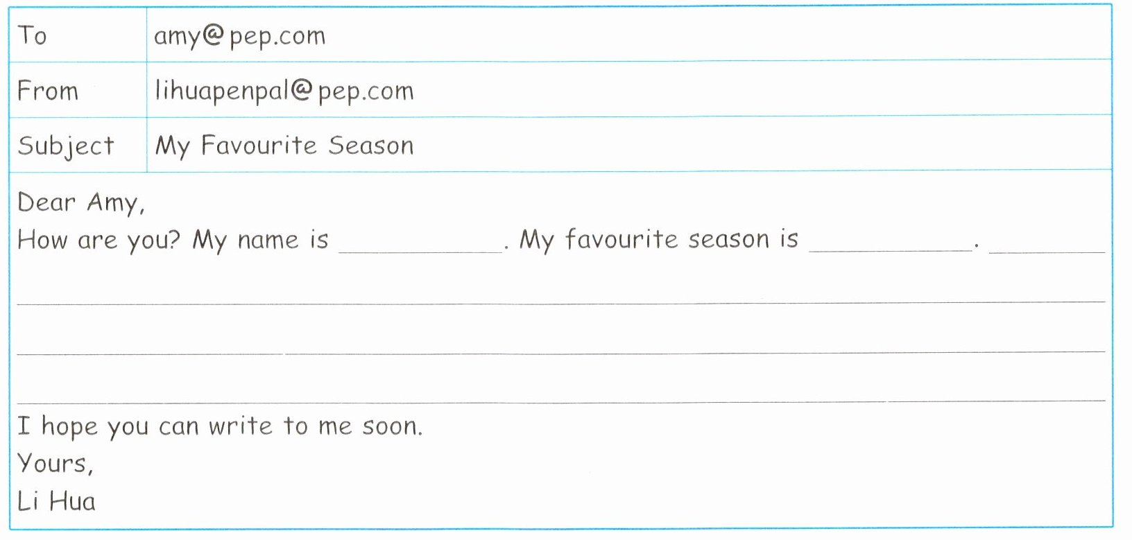 假设你叫李华,请以“My Favourite Season”为主题,写一封邮件给Amy,介绍一下你最喜欢的季节,包括这个季节的天气、穿着和活动。