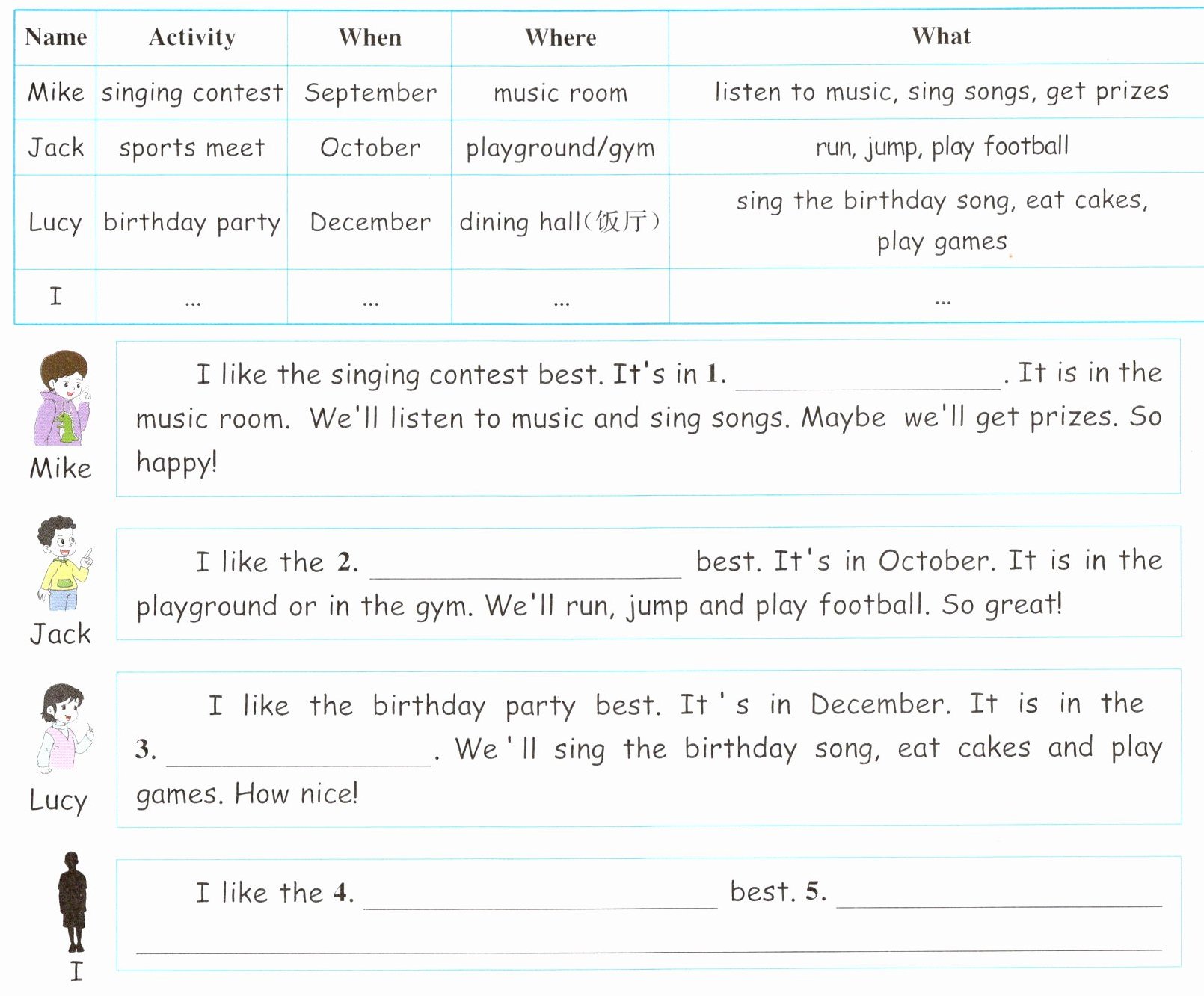 September@@sports meet@@dining hall@@English party@@It's in March. It is in the classroom. We'll sing English songs and tell English stories. How nice!