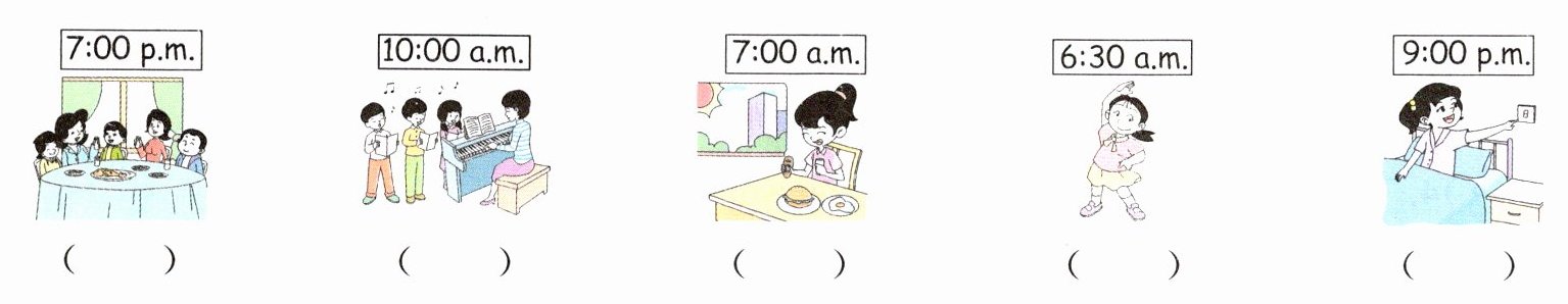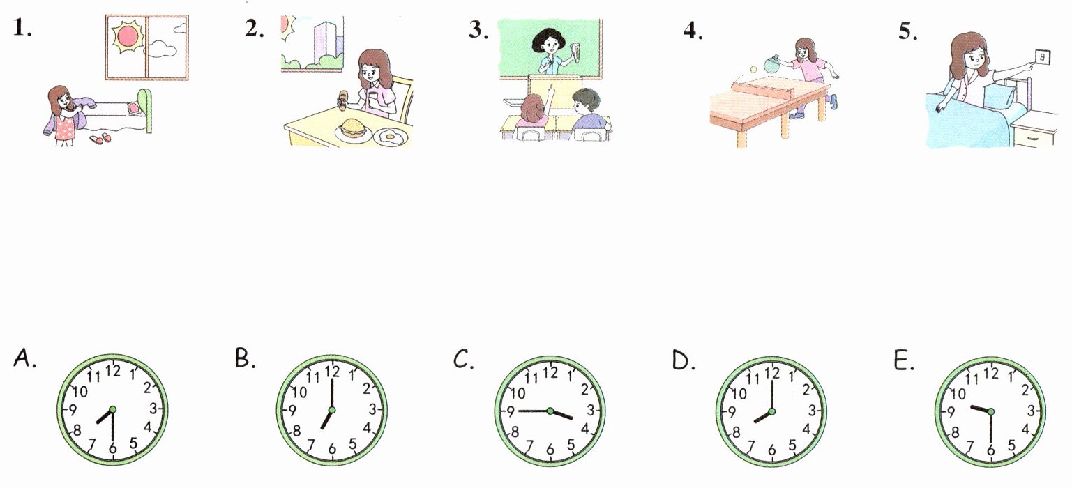 1. eat breakfast 2. 7:30 a.m 3. 8 o'clock 4. 4 o'clock 5. play sports 6. 5:00 p.m