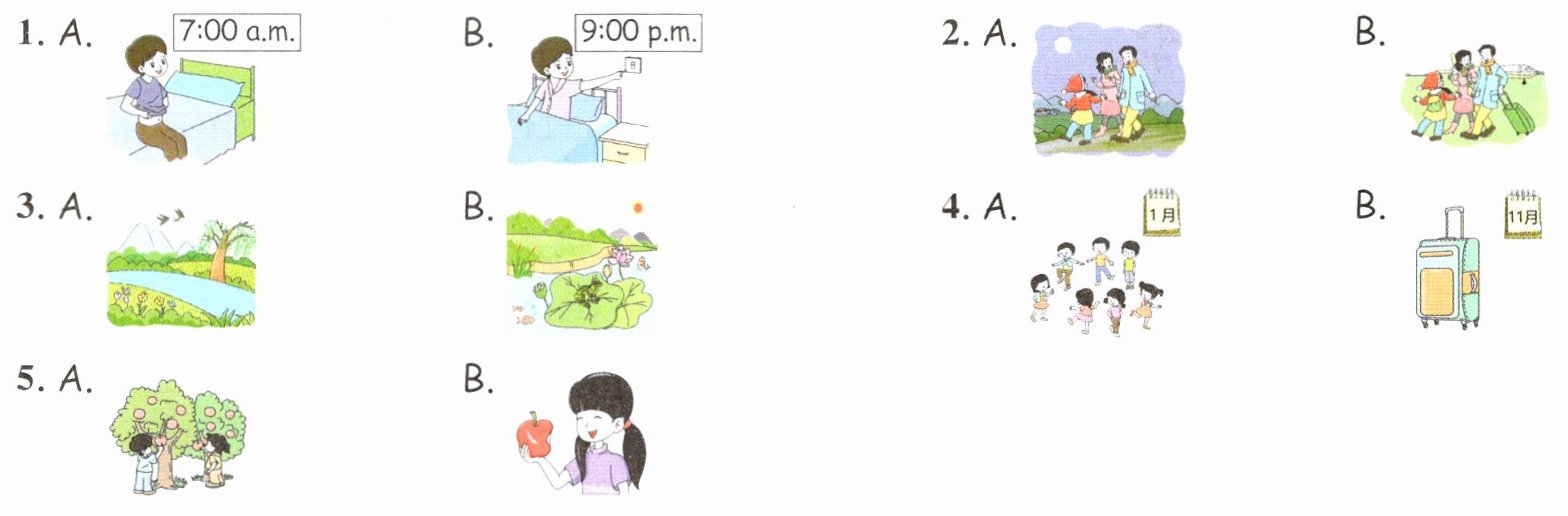 - **二、听录音,圈出与所听内容相符的图片的序号。**