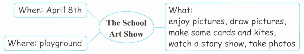 April@@art show@@April 8th@@playground@@enjoy a lot of beautiful pictures there. We will draw some pictures, too. And we can make some cards and kites in the handmade area. We can also watch a story show. And we can take some photos on that day. I think it will be very interesting on that day.
