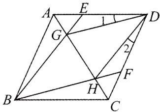 11.如图,在菱形$ABCD$中,点$E$在$AD$上,$F$在$CD$上,$BE$、$BF$分别交$AC$于$G$、$H$,$\angle EBF = 35^{\circ}$,$\angle BAD = 100^{\circ}$,求$\angle 1+\angle 2$的度数。