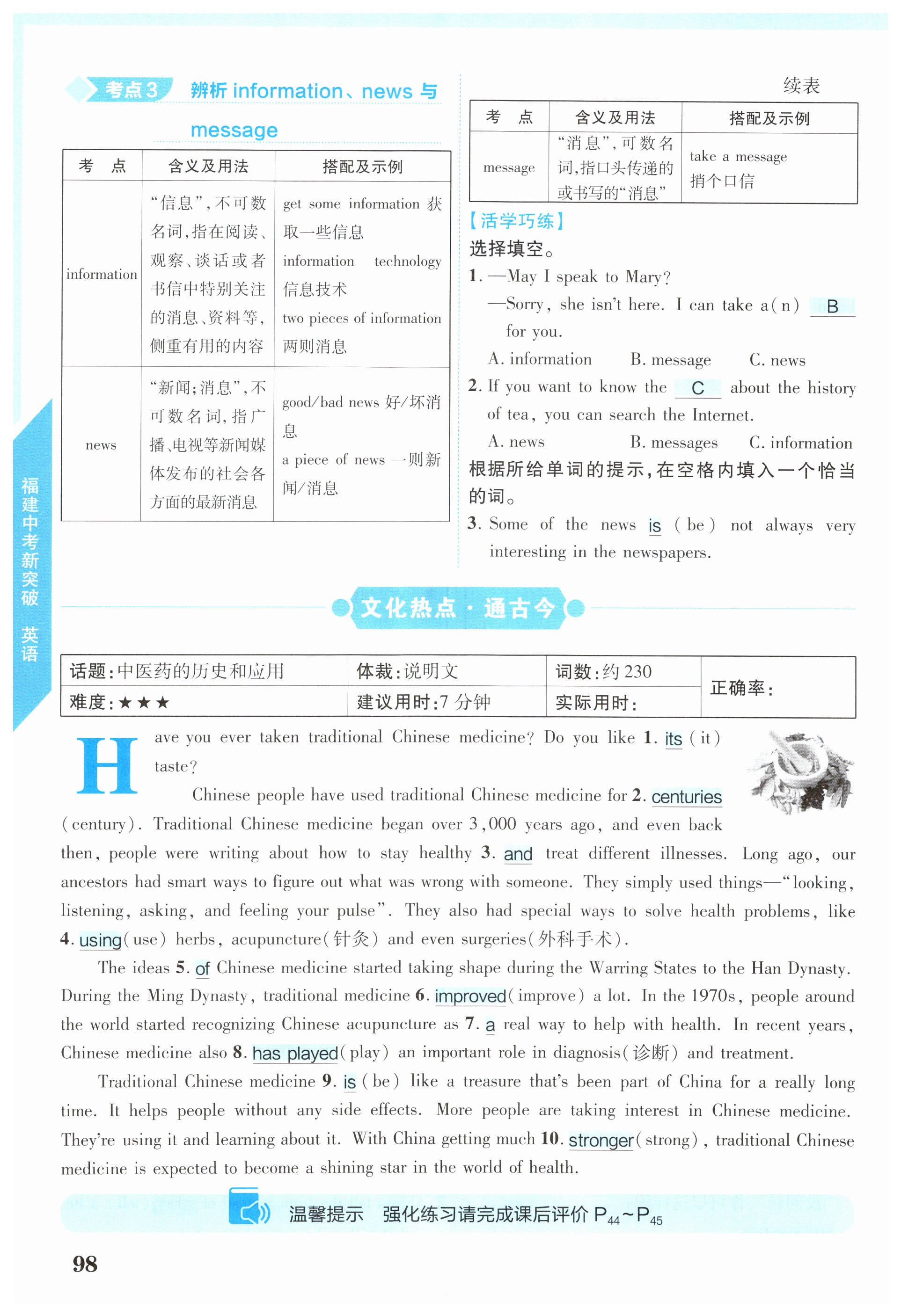 注:目前有些书本章节名称可能整理的还不是很完善,但都是按照顺序排列的,请同学们按照顺序仔细查找。练习册 2025年中教联中考新突破英语福建专版 答案主要是用来给同学们做完题方便对答案用的,请勿直接抄袭。