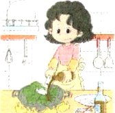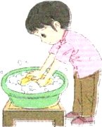 (1. Saturday 2. bathroom 3. washing clothes 4. kitchen 5. cooking lunch)