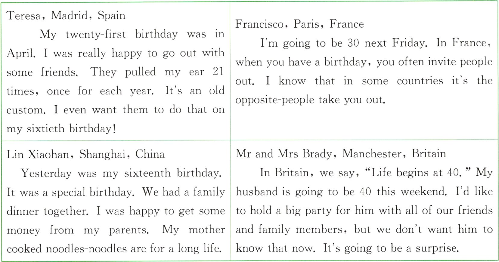 1. 根据第一个表格里的“It’s an old custom.”可知,在西班牙,扯耳朵是生日习俗,故本题正确。