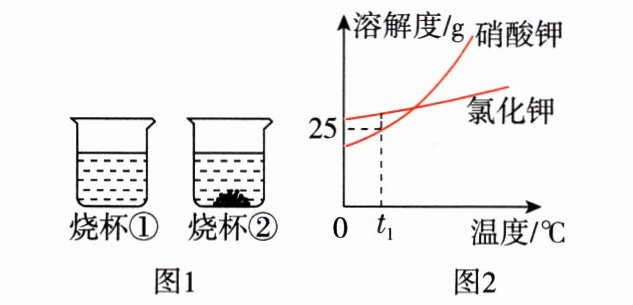 7. t₁℃时,将等质量的硝酸钾和氯化钾分别加入盛有100g水的两个烧杯中,充分搅拌后现象如图1所示,硝酸钾和氯化钾的溶解度曲线如图2所示。下列说法错误的是 ( )
