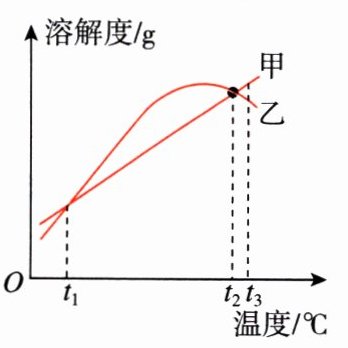 - (3)$t_2℃$时,将等质量的甲、乙两物质的饱和溶液降温到$t_1℃$,该温度范围内,两种物质的溶解度差相等,析出晶体的质量相等。