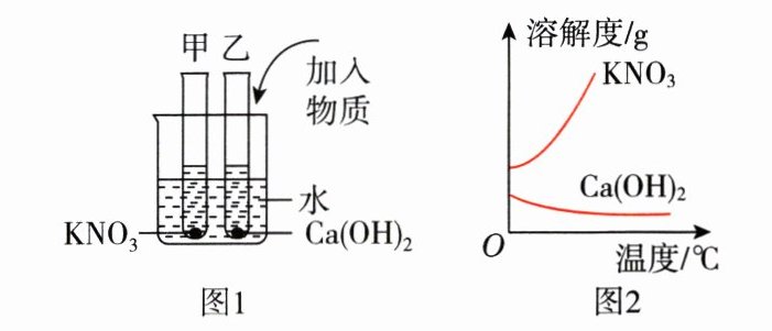6. 如图1所示,甲、乙试管中分别盛有硝酸钾、氢氧化钙的饱和溶液,试管底部均有未溶解的固体。二者的溶解度曲线如图2所示。向烧杯中加入一定质量的氢氧化钠固体后,下列分析正确的是 ( )