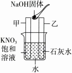 3. [2024陕西师大附中二模]如图所示,室温下,盛有水的烧杯内放置了甲、乙两支试管,甲、乙试管中分别盛放的是KNO<sub>3</sub>饱和溶液和一定溶质质量分数的石灰水。向烧杯内的水中加入NaOH固体后,乙试管中观察到变浑浊的现象(不考虑溶剂蒸发)。下列说法中,正确的是 ( )