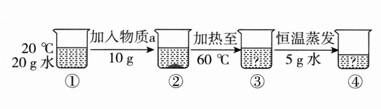 B 点拨:60℃时氯化钠的溶解度为37.1g,③中水的质量为20g,则最多能溶解7.42g氯化钠,加入氯化钠的质量为10g,氯化钠不能完全溶解,则③中的溶液是饱和溶液,A错误;④中水的质量为15g,a的质量为10g,若a是氯化钠,则④中溶液为60℃时氯化钠的饱和溶液,其溶质质量分数为$\frac{37.1g}{137.1g}$×100%≈27.1%,B正确;60℃时硝酸钾的溶解度为106g,③中水的质量为20g,最多能溶解21.2g硝酸钾,若a是硝酸钾,则③中硝酸钾溶液为不饱和溶液,④中水的质量为15g,最多能溶解硝酸钾的质量为15.9g,则④中硝酸钾溶液仍为不饱和溶液,C错误;实验能证明溶液是否饱和与温度、溶质的量、溶剂的量有关,由于实验中所涉及的溶剂只有水,故不能证明溶液是否饱和与溶剂的种类有关,D错误。