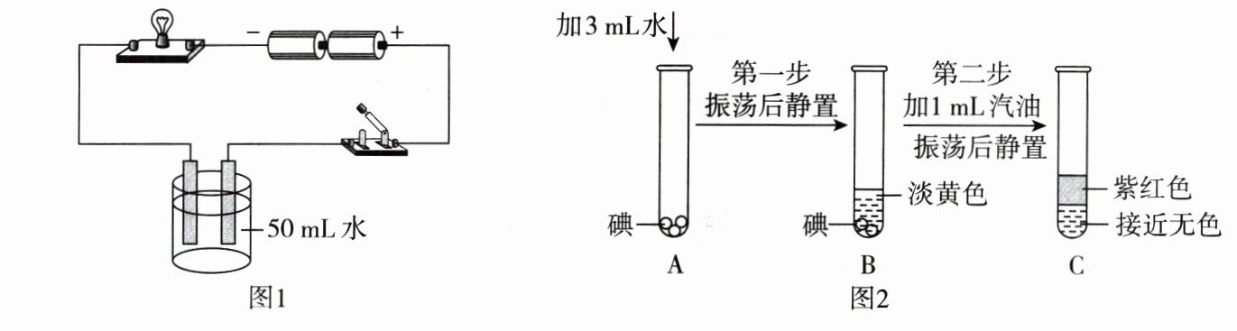 按图1所示进行实验。闭合开关,观察到小灯泡不亮。再将10 g氯化钠放入水中,观察现象。