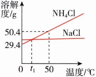 D 点拨:比较不同物质的溶解度大小必须说明具体温度,否则不能比较溶解度大小,故A错误;t₁℃时,虽然NaCl、NH₄Cl的溶解度相等,但NaCl、NH₄Cl的饱和溶液的质量不能确定,所以饱和溶液中溶质的质量不能确定,故B错误;NH₄Cl的溶解度受温度变化影响较大,所以除去NH₄Cl中的NaCl,可用降温结晶的方法得到NH₄Cl固体,故C错误;50℃时NH₄Cl的溶解度是50.4g,0℃时NH₄Cl的溶解度是29.4g,则将150.4g 50℃的NH₄Cl饱和溶液冷却至0℃,析出晶体的质量为50.4g - 29.4g = 21g,如果将100g 50℃时NH₄Cl饱和溶液冷却至0℃,析出晶体的质量小于21g,故D正确。