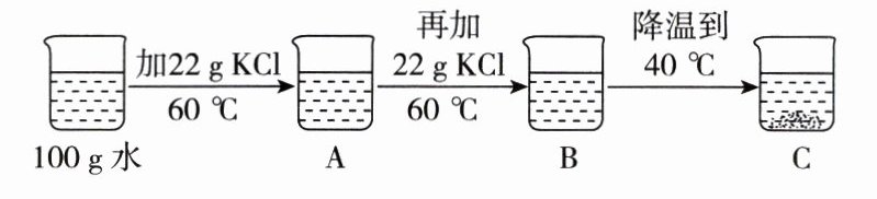 (3)某同学进行如图所示实验,得到相应的A、B、C三种溶液,C中析出氯化钾固体的质量为_______g。为使C中固体全部溶解,至少需加入_______g水。
