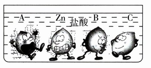 8. 四支试管中分别盛有相同溶质质量分数的稀盐酸,将A、B、C和锌四种金属分别同时放入试管中,小明将观察到的现象形象地画成了一幅卡通画,如图所示,每个卡通人物表示一种金属,周围的小黑点表示反应中生成的气体。