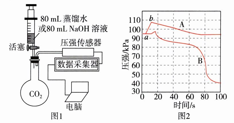 10. [2024·菏泽 创新题·数字化实验]某兴趣小组利用图1装置,对“CO₂和NaOH溶液能否反应”进行数字化实验再探究。实验1:在盛满CO₂的烧瓶中滴加80 mL蒸馏水;实验2:在同样的烧瓶中滴加80 mL NaOH溶液。实验得到如图2所示曲线。下列说法不正确的是 ( )