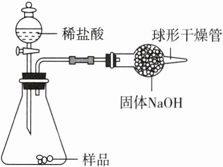 方案二:如图所示,取样品于锥形瓶中,加入足量稀盐酸。反应结束后,根据球形干燥管的增重计算$Na_{2}CO_{3}$的质量分数。