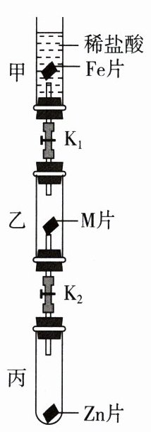 2. [2024 常州田家炳中学一模 创新题:实验创新] 为比较金属 M 与 Fe、Zn 的金属活动性强弱,实验小组设计了如图装置。待甲中充分反应后打开 K₁,使甲中溶液全部进入乙中,乙中无明显现象,打开 K₂使乙中溶液全部进入丙中,观察到 Zn 片表面变黑(金属片均足量)。下列有关说法正确的是( )