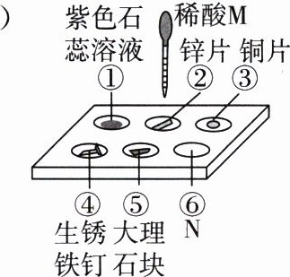 A 点拨:⑥处发生的是酸碱中和反应,则N一定是碱溶液,但不一定是烧碱溶液,A错误;氧化铁与酸反应生成铁盐和水,铁盐溶液为黄色,生锈铁片中的铁也能与盐酸反应,生成氢气,④处若滴加过量酸溶液,现象是铁锈消失、溶液变黄、一会儿后有气泡产生,B正确;①处石蕊遇酸溶液变红色,②处锌与稀酸反应产生气泡,④处铁锈的主要成分是氧化铁,氧化铁与酸反应,铁锈消失、溶液变黄,⑤处大理石的主要成分是碳酸钙,碳酸钙与酸反应产生气泡,则M可能为稀盐酸或稀硫酸等,C正确;根据②、③处是否有气泡产生,可比较锌、铜的金属活动性强弱,D正确。