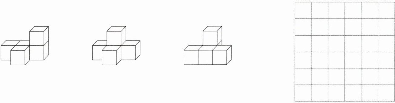 3. 从前面、上面和左面观察下面三个物体,从( )面看到的图形相同,请在方格纸上画出从这个方向看到的图形。[★★]