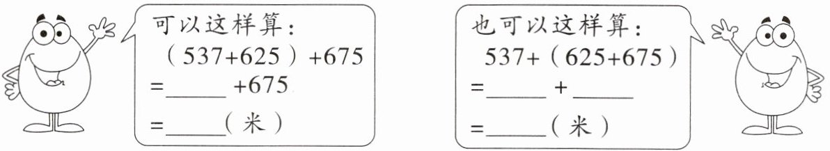 我发现:三个数相加,先把_____两个数相加,或者先把_____两个数相加,_____不变。这叫作加法结合律。用字母表示:$(a + b) + c = a +$(_____ + _____)。