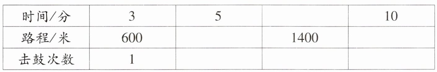 3.“记里鼓车”是中国古代的一种计量行程的机械装置,类似于现代汽车的里程表,车每行一里路,击鼓一下,每行十里路,敲打铃铛一次。如果一辆记里鼓车3分钟能行600米,请你根据这一数据填写下表。(1里 = 500米)[★★]