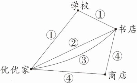 (1)优优从家去书店买书,走第( )条路最近,因为( )和( )。