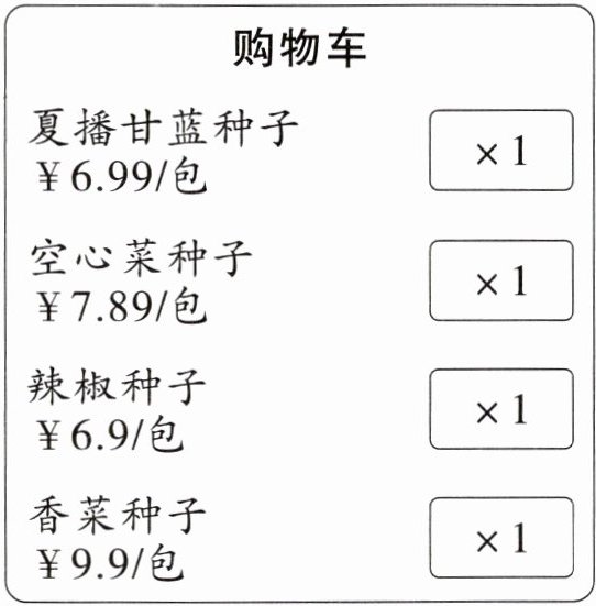 4. 劳动最光荣!学校为每个班分配了一块试验田,四(1)班同学们准备在试验田种一些蔬菜,需要买一些种子,下图是添加到购物车内一些种子的价格。[★★★]