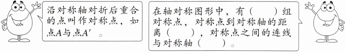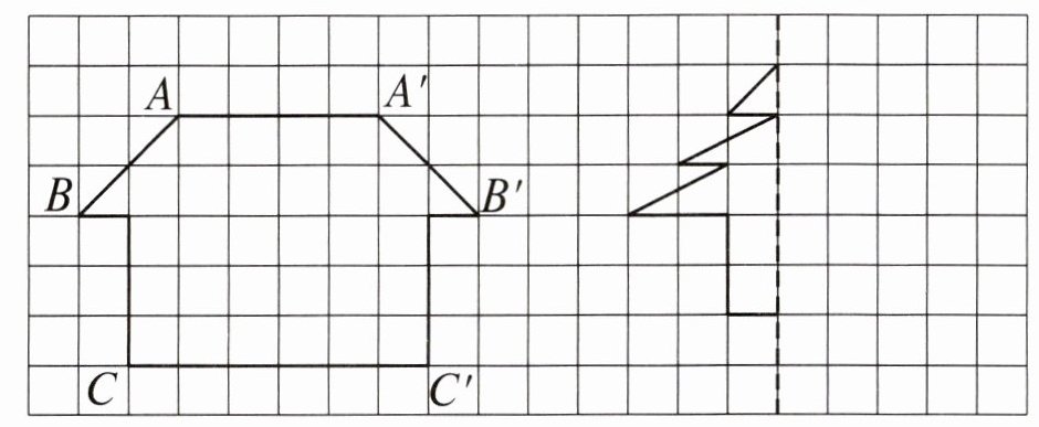 (2)观察左上轴对称图形发现,点A与点A'到对称轴的距离都是( )小格,点B与点B'到对称轴的距离都是( )小格,点C与点C'到对称轴的距离都是( )小格。