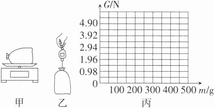 14. 小明用家里的器材探究重力的大小与质量的关系。如图甲、乙所示,用布袋装着质量不同的米,用电子秤测其质量,用液晶屏拉力器测其重力,实验数据记录如下表: