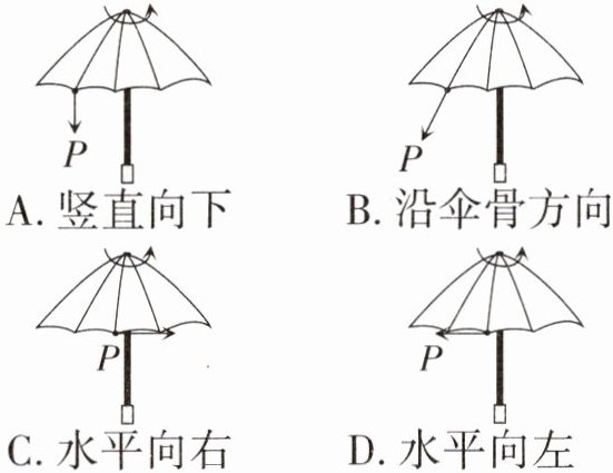 7. 雨伞在雨中快速旋转时(从上往下看沿逆时针方向),伞边缘的雨滴会被甩出。下图中能正确表示雨滴P被甩出瞬间运动方向的是 ( )