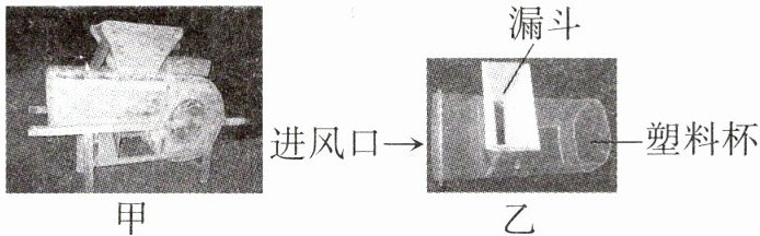 小华为了仿制老式风扇车,利用废旧塑料板制成一个漏斗,取废旧塑料杯切去杯底并在杯壁裁出一大一小两个缺口,将制成的漏斗插入小缺口,组装成了如图乙的装置。然后用质量不同的砂砾模拟谷粒和空壳进行实验。