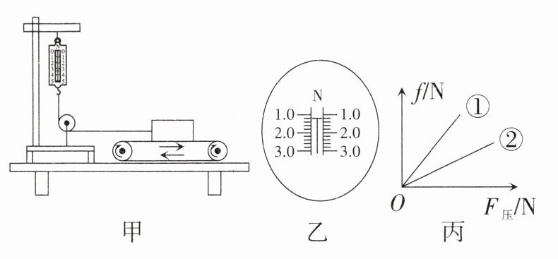 (3)将木块的上、下表面先后贴放在传送带上,并分别在木块上放不同质量的砝码进行实验,绘制出摩擦力与压力之间的关系图像如图丙所示。由图可知,滑动摩擦力的大小不仅与压力大小有关,还与____________________有关;当较粗糙的上表面贴放在传送带上进行实验时得到的实验图像应为__________(选填“①”或“②”)。
