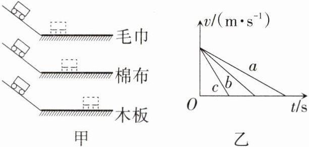 (8)如图乙是小车在不同物体表面上运动时速度与时间的关系图像,其中表示在毛巾上运动的图线是____(选填“a”“b”或“c”);在光滑水平面上运动的小车,如果受到的阻力为零,请在图乙中大致画出小车此时的速度与时间的关系图像。