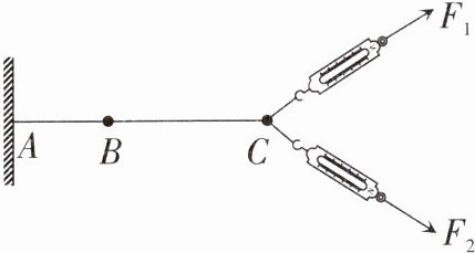 (1)如图所示,橡皮筋原长为$AB$,通过两个弹簧测力计对橡皮筋施加互成一定夹角的两个力$F_{1}$和$F_{2}$,使橡皮筋伸长到$C$,记录此时$F_{1}$、$F_{2}$的大小。撤去力$F_{1}$和$F_{2}$后,用一个弹簧测力计对橡皮筋施加一个力$F$的作用,为了使这个力$F$的作用效果与那两个力$F_{1}$、$F_{2}$的作用效果相同,应使橡皮筋______________,记录此时$F$的大小。