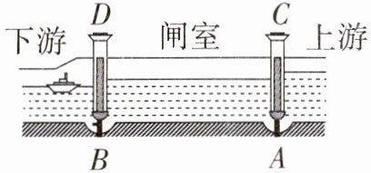 4. 如图,轮船由下游经过船闸驶往上游。船在下游要进入闸室,先关闭阀门A和闸门C,再打开阀门________,当闸室中水位与下游水位__________时打开闸门D,船就可以驶入闸室。船闸是利用____________的原理进行工作的。