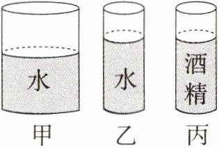 1. 如图所示,甲、乙、丙是三个圆柱形容器,容器内分别装有水或酒精($\rho_{水}>\rho_{酒精}$)。甲容器中液体高度小于乙,乙和丙两容器的底面积和液体高度都相同,则容器底部所受液体压强最大的是 ( )